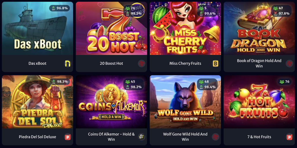 Căutarea jocurilor se realizează manual ori folosind denumirea furnizorului sau alegând una dintre categoriile predefinite (Fast Games, Slots, Bonus Buy, Hits, Popular, New). Jucătorii au la dispoziție tematici variate, precum sport, aventură, fructe, nestemate, jokeri, magie, acțiune, pescuit, animale, fantezie, mitologie, civilizații antice, groază, dulciuri, povești și multe altele.